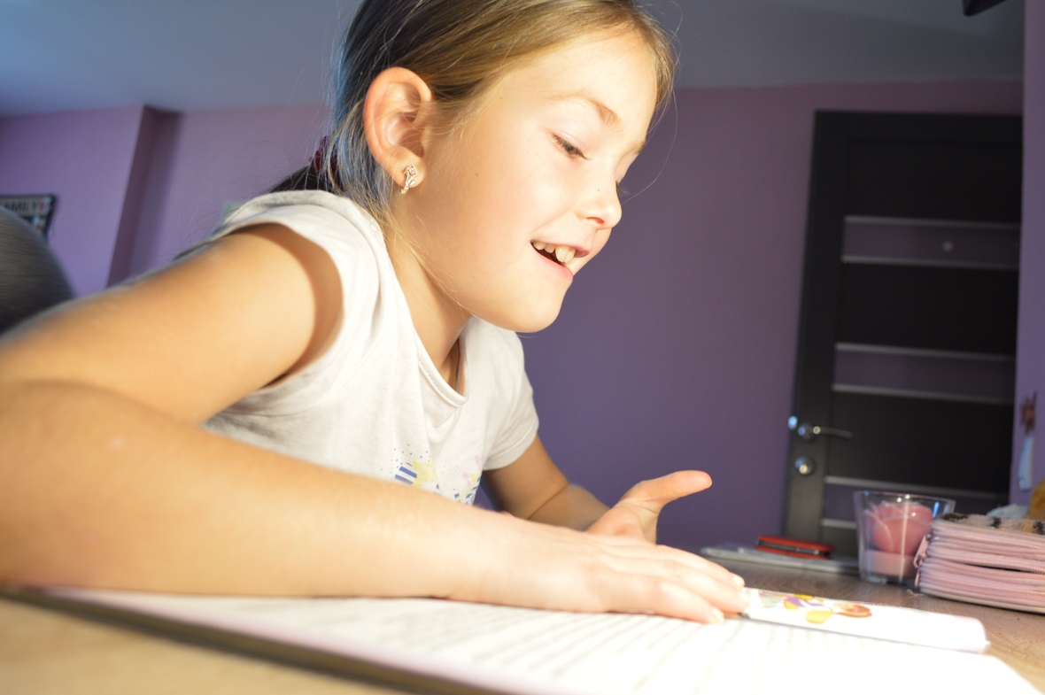 Andi az ujjával folyamatosan követi a szöveget, nehogy elveszítse a fonalat, ha esetleg rá kerülne a sor. Ez a feladat már lényegesen több koncentrációt igényel a részéről, de ezúttal sem a körülötte lévő játékok, sem az izgés-mozgás nem zavarja meg különösebben. Még egy kis útbaigazítás a tanító nénitől, és kész is vannak mára.