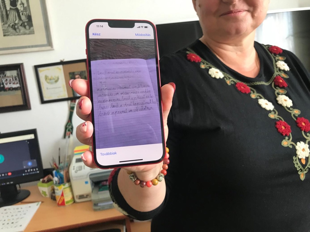 Emese tanító néni próbált mindenkire gondolni, azokra is, akik eszközhiány miatt nem tudnak belépni az online órákra. Voltak olyan családok, akiknek ideiglenesen tableteket ajánlottak fel az iskolából, ám ha valami történne a készülékkel, ki kellene fizetni azt, amit egy-egy család nem engedhet meg magának. Így vannak tanulók, akiknek a tanító néni videókat vesz fel, külön feladatokat hagy fel nekik. A fenti képen az egyik ilyen diák megoldott házi feladatát mutatja épp nekünk.