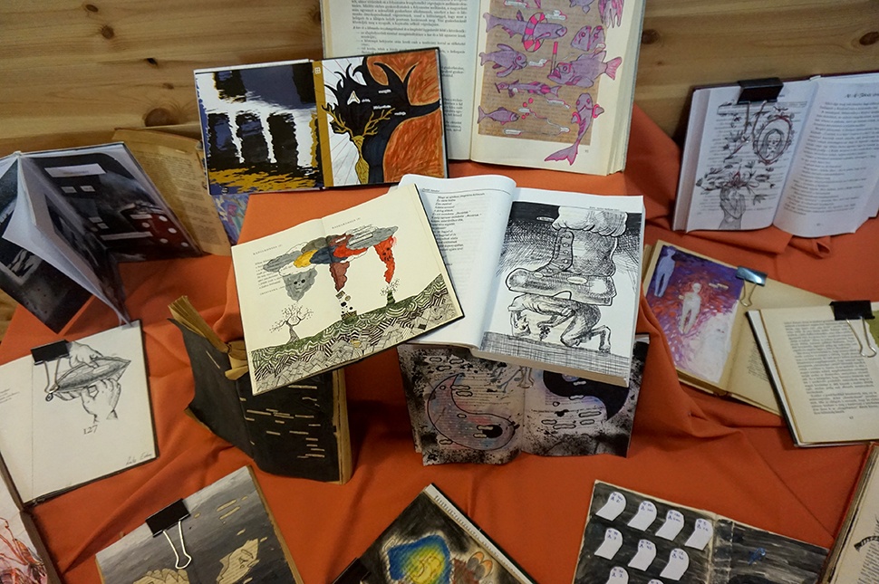 Lefele indultunk. A kiállító teremben az irodalom és a képzőművészet találkozott, itt sokáig időztünk. Elcsodálkoztunk az alkotások sokszínűségén, az emberi kreativitáson: az alapkoncepció mindegyik könyvnél ugyanaz volt, a kivitelezés viszont mindenhol más, mindenhol egyedi.