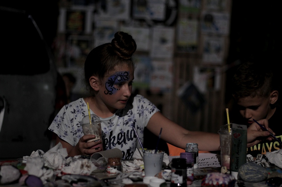 Mi a kőfestést választottuk az udvaron. Majd meglestük a szabadtéri sakkot, és még egy arcfestésen is elgondolkodtunk. Befele a könyvturkálónál megálltunk pár pillanatra, de túl sokan próbáltak be- vagy kijutni rajtunk keresztül, úgyhogy ezt későbbre hagytuk.