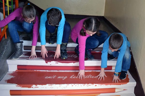 A tanulók simogatták, ráfekve és mellé térdelve olvasgatták az iskola új lépcsőfokait.
