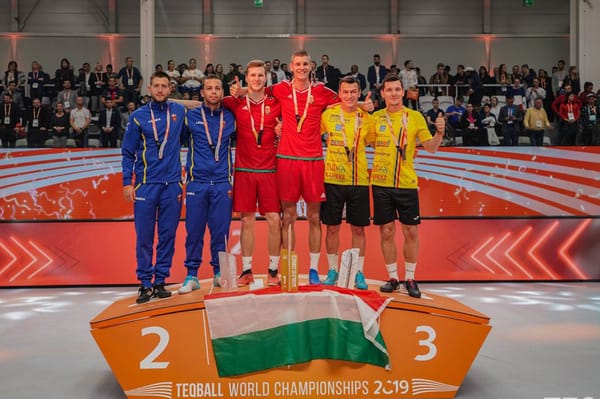 Ronaldinho előtt aggathatnak érmet Lázár, Ilyés, Györgydeák és Mitri nyakába a harmadik teqball világbajnokságon.