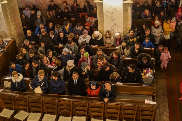 Kaláka koncert. Lefoglalt főpadsor. Elégedetten mosolygó polgármester az első sorban. Unatkozó gyerekek az oszlopok mögött és a padsorok között a földön.