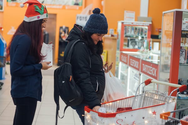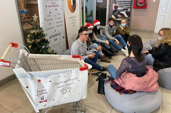 Fiatalok gyűjtenek adományokat a rászoruló családoknak a Merkúr áruházak bejáratánál.