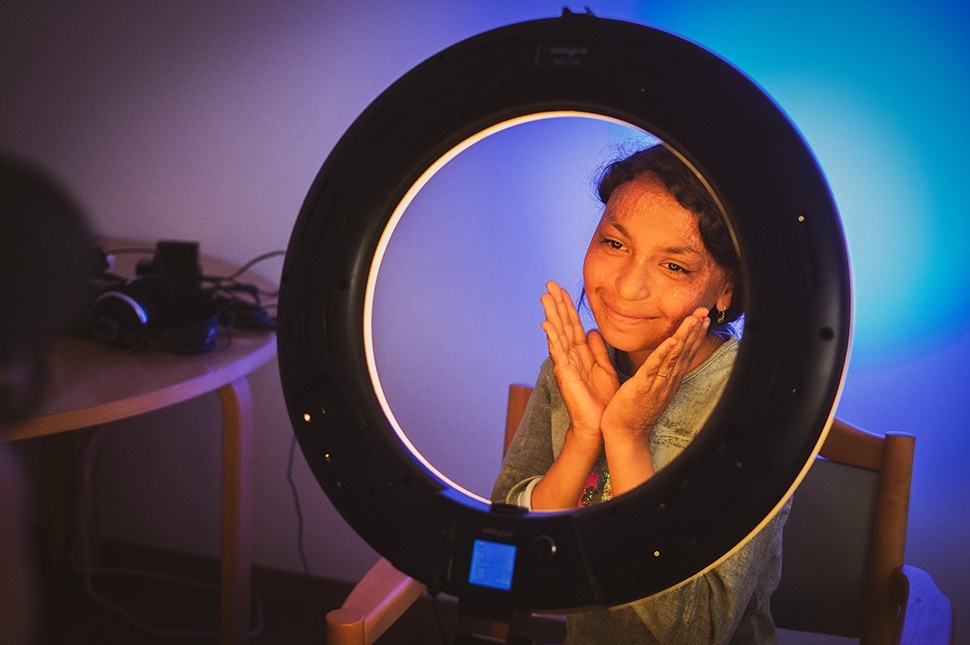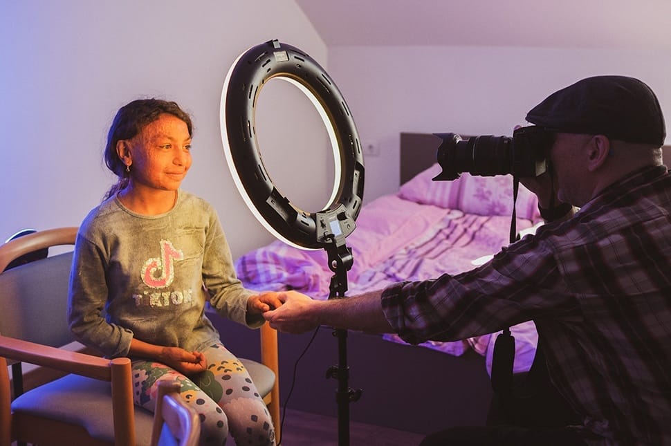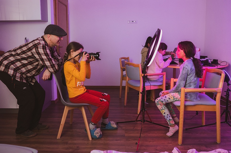 A rajzok otthon-témában készülnek, az eddigi foglalkozásokon – mint megtudjuk – volt, aki a családját vagy a telepen élő állatokat rajzolta le, más egy vágyott játszóteret, többen pedig a Tamás bácsival közös kirándulások helyszíneit – a borvízfürdőt, a patakot és a „betűket”, pontosabban a Csíksomlyói nyeregben található Misericordia feliratot. A portréfotózás során a gyerekek maguk választhatják ki, milyen színnel kerül megvilágításra az arcuk, illetve a mögöttük húzódó fehér fal.