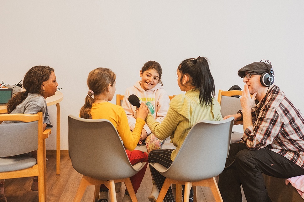A mostani foglalkozások harmadik eleme a beszélgetés, amely során Tamás rövidke, hangfelvevőre rögzített interjút készít a résztvevőkkel, egyenként, és mivel a gyerekek szeretnek új dolgokat kipróbálni, gyakran ők is előlépnek riporterré. A hangulat kedves, családias, de legfőképp békés és biztonságos. Nincs rossz válasz, kérdezni mindig szabad és bárki bármikor rázendíthet egy Tamás bácsitól tanult angol dalocskára, a többiek biztosan csatlakoznak.