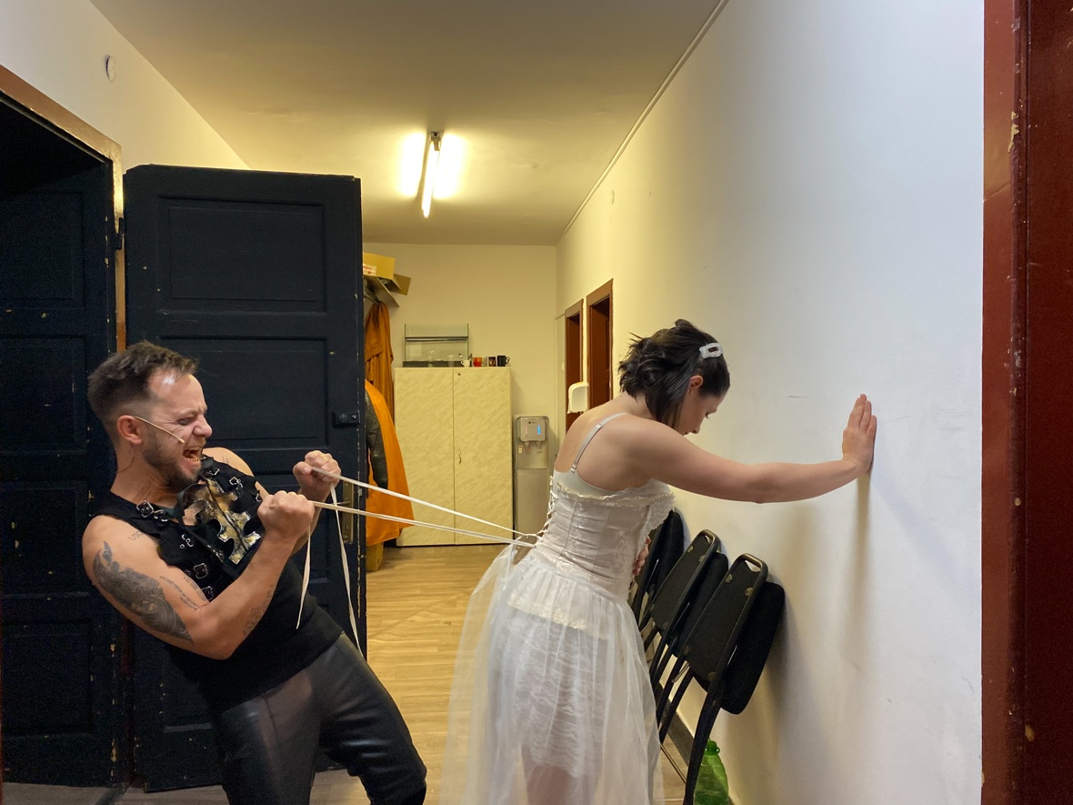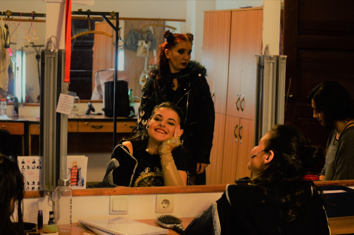 „A próba véget ért, este hét órakor kezdődik az előadás” – hallatszik egy hang a színpad mögülről, ami Máthé Miklós Mónikától, a színház ügyelőjétől jön. Ő felel azért, hogy a kellékek a helyükön legyenek, és ha kell, akkor súg is. Általában kettő-másfél órával szeret bent lenni előadás előtt, de ha kell, próbák előtt is bejön, hogy minden rendben legyen.