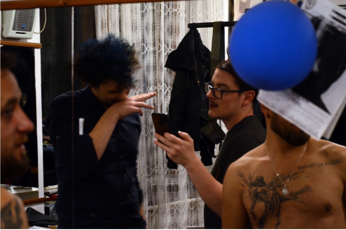 Míg zajlik az előadás, a színészek egy része az öltözőben várja, hogy színpadra lépjen. Addig is bemelegítik arcizmaikat: mosolyognak, mindenféléről csacsognak. „Ugyanúgy tudok izgulni, mint huszonegy évvel ezelőtt, amikor itt kezdtem a pályafutásom. Azt hittem, hogy ez azért elmúlik egy idő után.” – meséli László Kata színésznő. „Nagyon kevés olyan színész van szerintem, aki nem izgul, bármilyen tapasztalt színészről legyen szó.”
