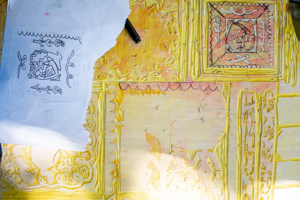 A rezidencia korlátozott ideje miatt kisebb formátumban dolgozik, mint általában. „Otthon a fő művem 120x100 centiméter, ami három hét munkája volt, itt viszont csak tíz nap áll rendelkezésemre. Ezért kisebb méretben készítem el a darabot, redukciós linómetszet technikával, ami rétegenként csökkenti a linóleumot.” Már az első réteg kinyomtatásánál tart, és folytatja a vágást és a nyomtatást.