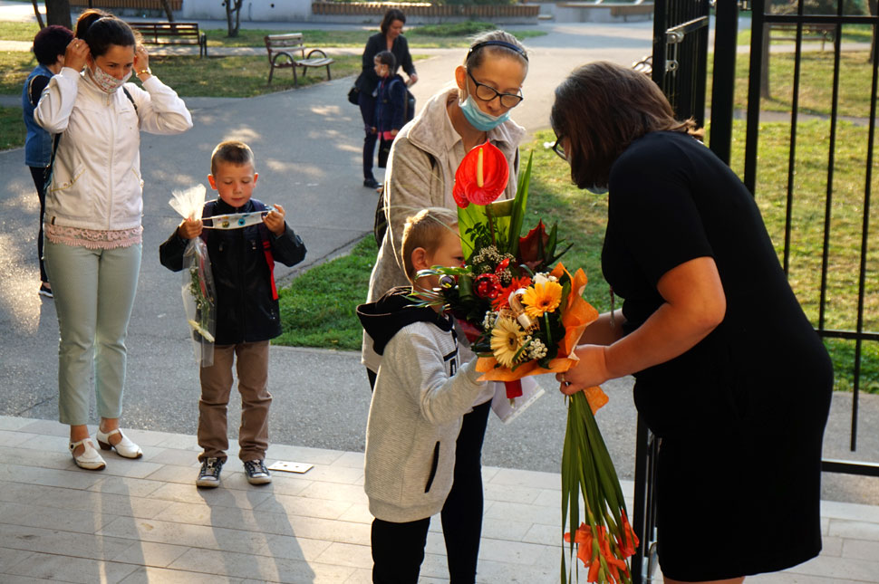 A Pedánál apuka igazítja kislánya maszkját, a gyerekek az udvaron énekelnek. Egészen megható, hogy a tanárok és a tanítók mennyire igyekeznek, hogy a korlátozások ellenére ünnepélyes hangulatot teremtsenek.