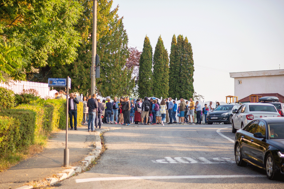 Így is kisebb tumultus alakul ki az utcán. Az Orbán Balázs előtt sor, pedig a különböző osztályok különböző időpontokban mennek be az iskolába. Maszk, virág a kezekben. Izguló felnőttek, vidám gyerekek.