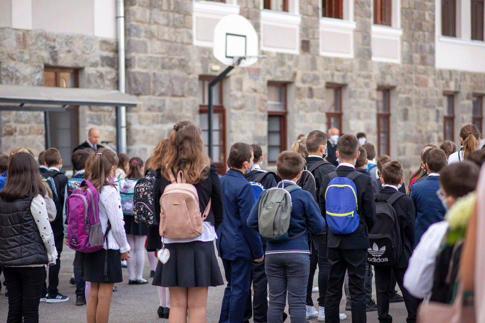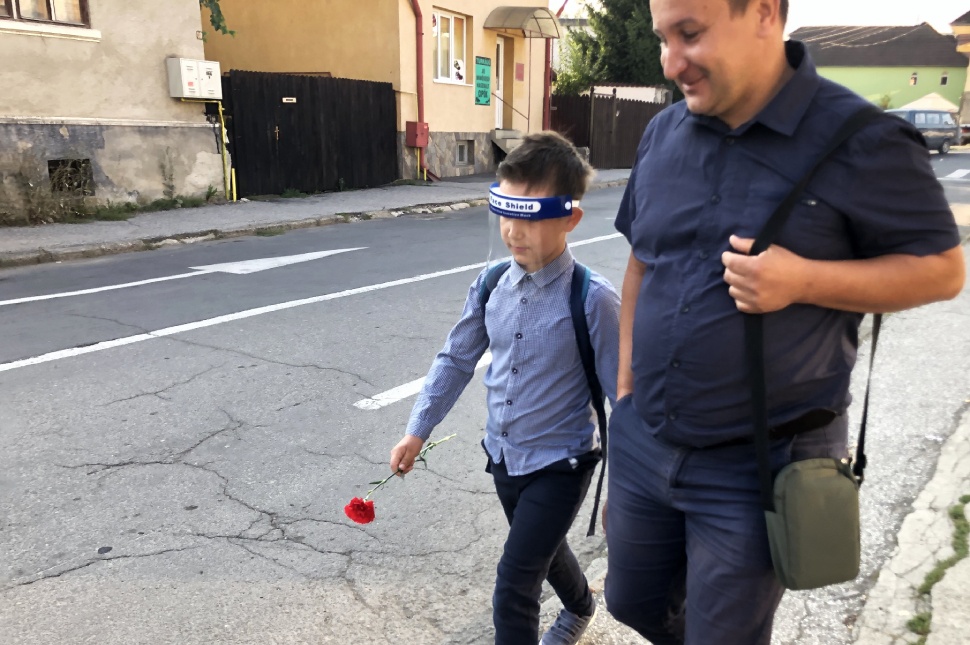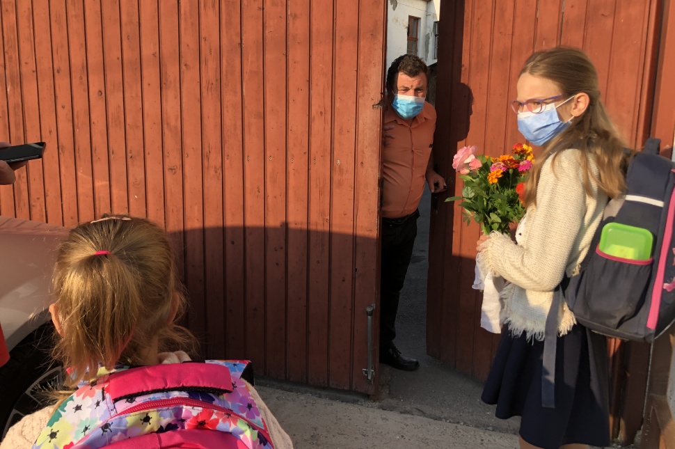 A Pedánál apuka igazítja kislánya maszkját, a gyerekek az udvaron énekelnek. Egészen megható, hogy a tanárok és a tanítók mennyire igyekeznek, hogy a korlátozások ellenére ünnepélyes hangulatot teremtsenek.