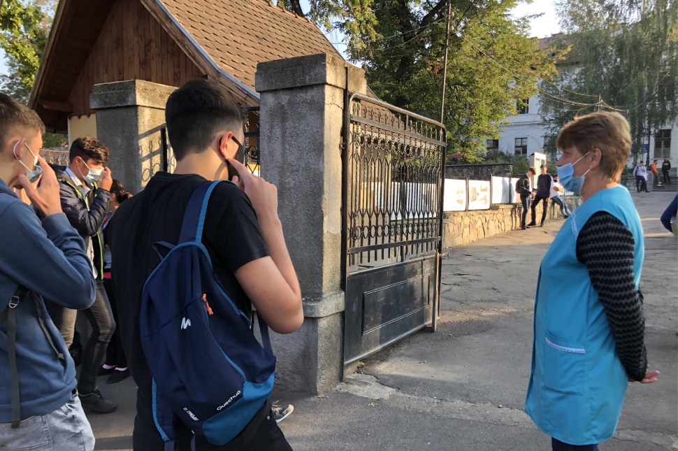 Az Eötvös József Szakközépiskolánál maszkos fiatalok mobiloznak. Két maszkos felnőtt, valószínűleg a kapusok, várja a középiskolásokat a kapuban, és figyelmezteti a másfél méter távolság betartására. Mindenkitől megkérdezik, maszkja van-e, mert ha nincs… Akkor adnak. Az idén nem büntetnek igazolatlannal, vagy rossz jeggyel, ha valami hiányzik.