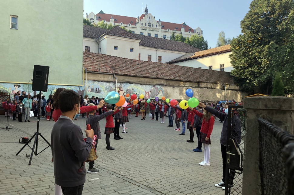 Színes dekorral próbálják ellensúlyozni a maszkos tanévkezdés szürkeségét. A legkisebbeket lufikapuval köszöntik.