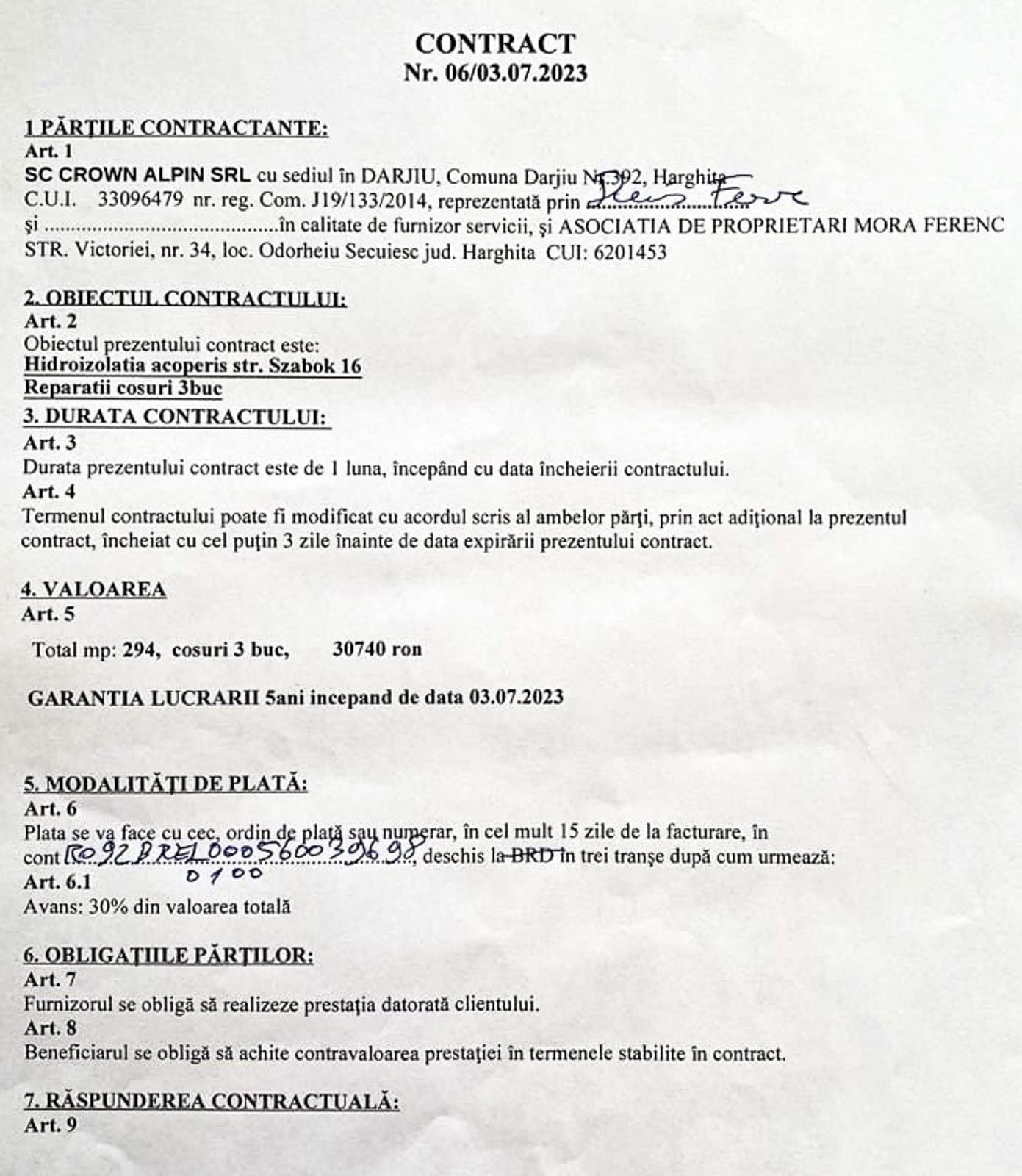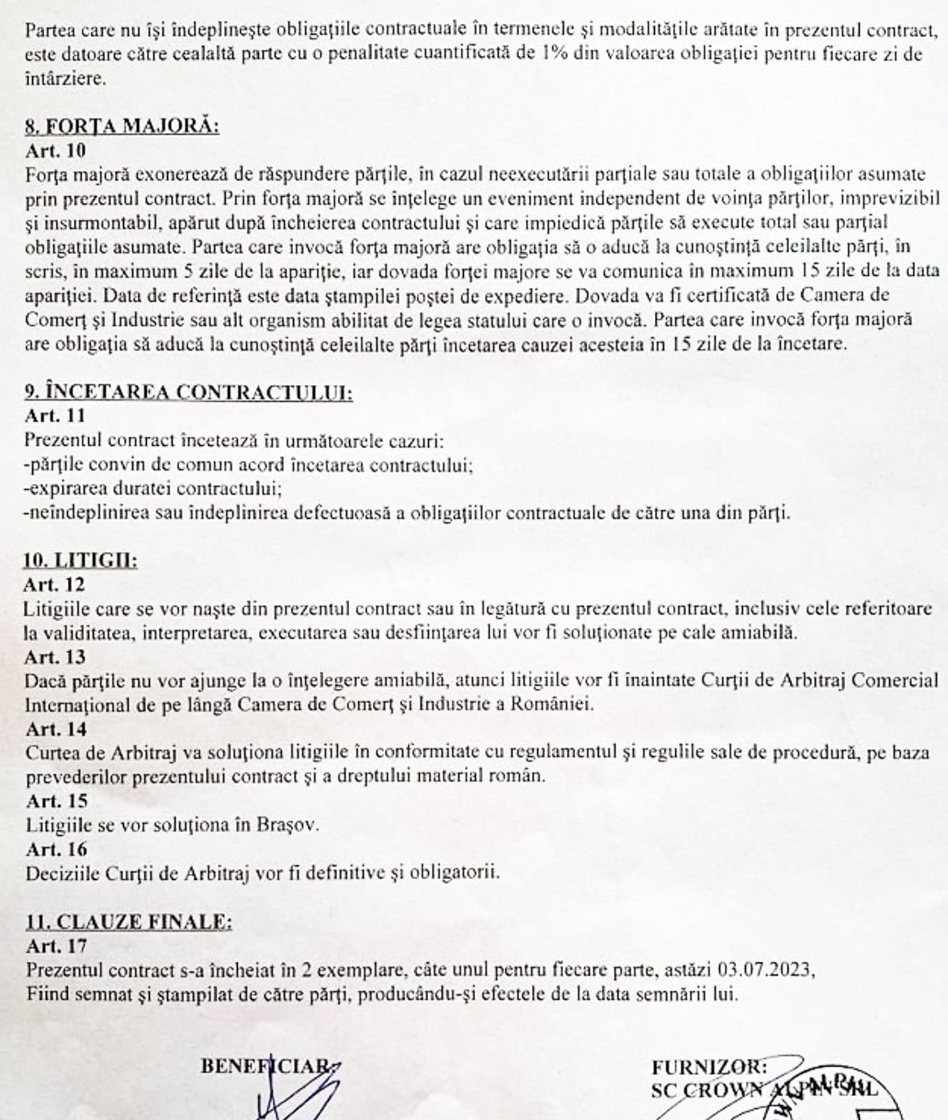 A szerződésben szerepel, hogy minden jogi nézeteltérést a Román Kereskedelmi és Iparkamara mellett működő Nemzetközi Kereskedelmi Döntőbíróságon kell letárgyaltatni. Brassóban. Ez is külön meg van határozva. Nem igazán érthető, hogy miért kellene két udvarhelyi fél Brassóba menjen pereskedni. Ez egyébként elriasztotta a panaszosokat, elmondásuk szerint úgy tűnt nekik, hogy a brassói pereskedés túl költséges, ezért elálltak tőle. Telefonos beszélgetésünk alkalmával megkérdeztem a kivitelező cég képviselőjét, Dénes Ferencet, hogy miért írták bele az általa hozott szerződésbe ezt a feltételt, erre azt mondta, hogy ezt a szerződést az internetről töltötték le, és az benne maradt.