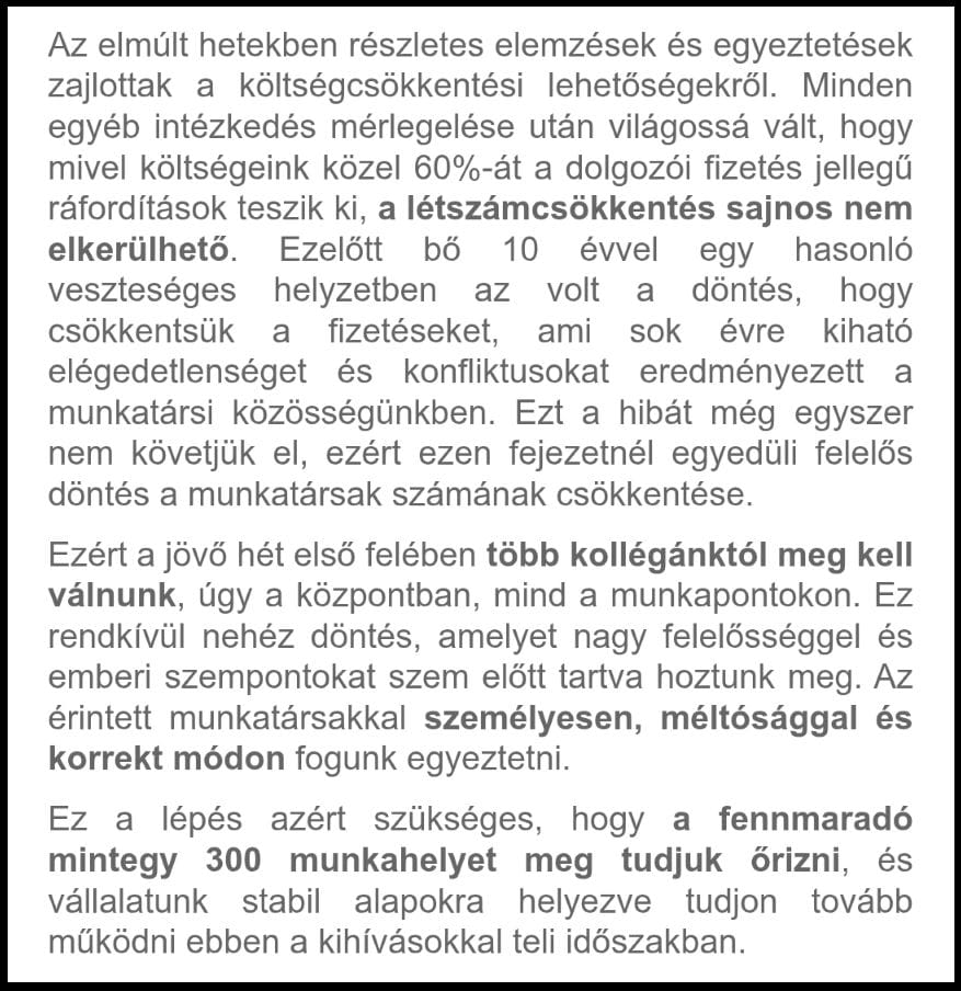 December közepén átküldtek nekünk egy levelet, amit a Melinda Instal igazgatója, András Lehel küldött ki az alkalmazottaknak, és amiben közli velük, hogy nagy elbocsátások lesznek. A panaszos második levelében kimondta a fájdalmát is: