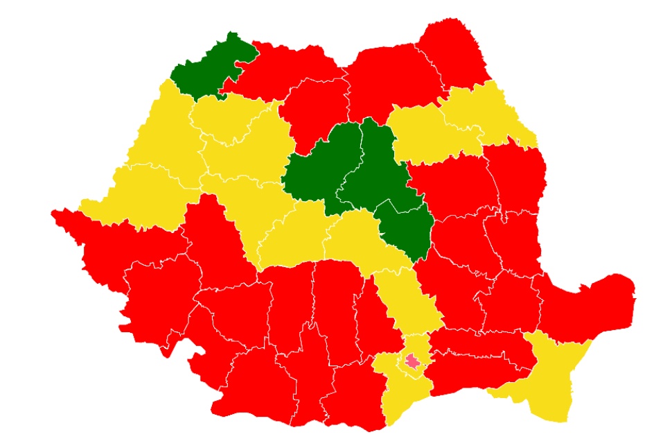 Megyei lebontásban a legtöbb polgármestert adó pártok. Piros: PSD, sárga: PNL, zöld: RMDSZ, rózsaszín: PSD-PNL szövetség.