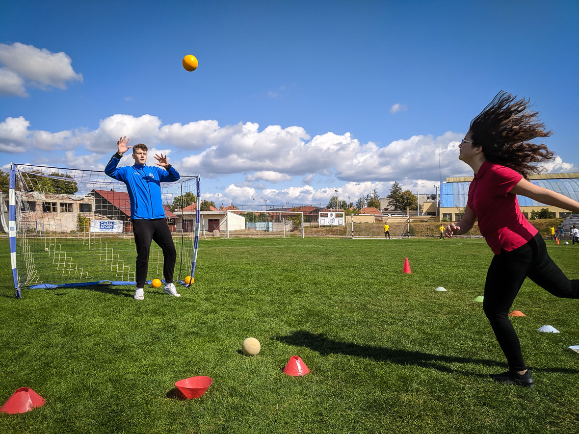 Foci pingpongasztalon – mondták a gyerekek a teqball asztalhoz érve, amelyet Ilyés Szabolcs, világkupa-bronzérmes teqballos, a világ legeredményesebb teqball-klubjának játékosa mutatott be nekik.