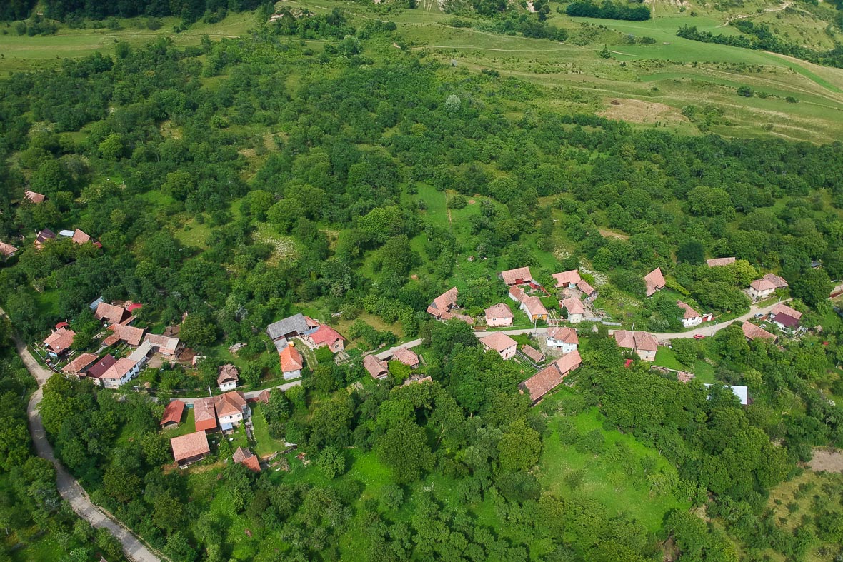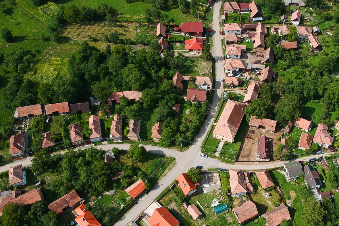 Az ilyen képeket is nagyon szereti Zsolt, amin látszik, főleg a balra és a felfele haladó utcákon, hogy miként épült fel egy székely porta. A ház hosszában a telken, merőlegesen az útra, aztán egy udvar, majd a csűr, keresztbe a telken, párhuzamosan az úttal. A csűrök egy vonalban helyezkednek el, és egyféle védőgyűrűt is alkotnak a házak körül, a vadállatok nehezebben tévedhettek be az udvarra. És végül, ami minket nagyon izgat, a csűr mögött mindenkinek volt egy csűrkertje, veteményessel és kis gyümölcsössel. Itt maradhattak fent azok a fajták, amik minket oly nagyon érdekelnek, illetve az udvaron, ahol régen meghagytak egy-két fát, sőt, a kapunál is szokott volt lenni egy-egy nagy vackorfa.
