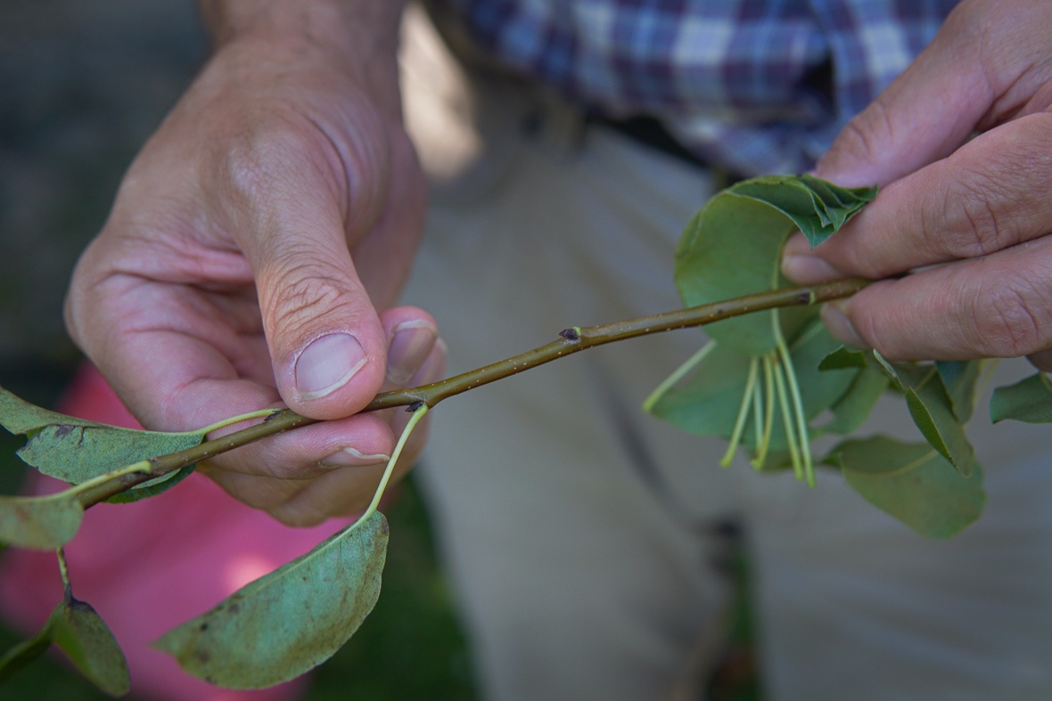 A fajták beazonosításánál nem csak a gyümölcs, hanem a levél is segíthet. Zsolt elmagyarázza Mónikának, hogy milyen bélyegeket lehet megfigyelni a levélen, ezt most túl hosszú lenne leírnom, és talán unalmas is, de amit érdekesnek tartok megjegyezni, hogy a leveleket mindig a hajtások közepéről szedik, nem a csúcsáról, nem a tövéről. Ezek a középről szedett levelek a legjellemzőbbek a fajtára.
