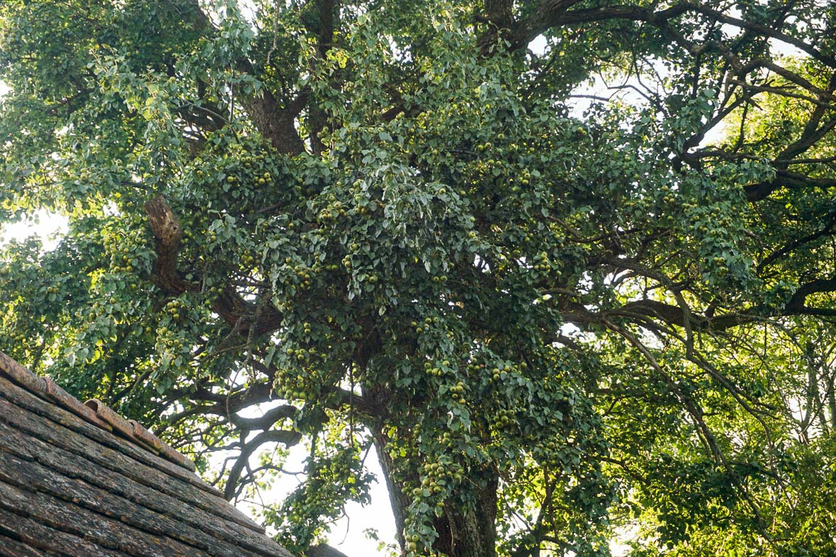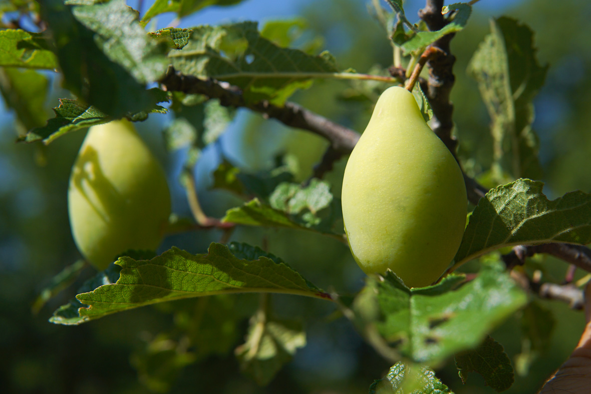 Én már jártam ezelőtt pár évvel itt Júlia néninél, akkor Sinka Arnold hozott, hogy szedjünk oltóvesszőt egy nagyon ritka és furcsa fajtájú, kipusztulóban lévő szilvafáról. Oltottunk is akkor a Kossós szilvából, a fák nőnek, szépek, de még nem teremnek, így én ezidáig a termését még nem láttam. Kihasználtam így az alkalmat és megkértem Domokost, hogy nézzük meg, van-e valami termés a fán, hadd lássam, hogy néz ki. Hát, így néz ki. Tényleg Kossós.