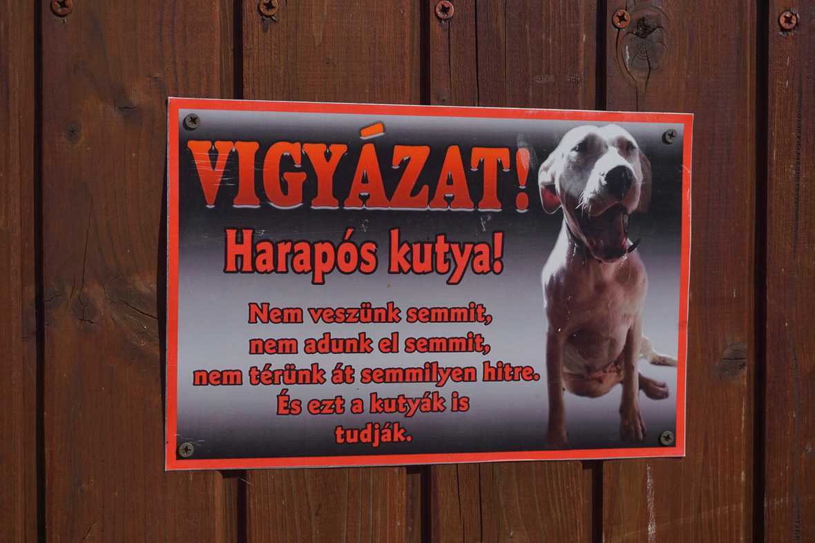 Ebéd után kóválygunk a faluban, próbálunk mindenfelé érdeklődni, de nem túl nagy sikerrel. Aki szóba áll velünk, az nem tud semmit, de vannak olyanok is, akik direkt ilyen táblákat raktak ki a kapura, amik ellenkeznek egyházunk hitével. Szégyen! Az ilyen táblákat be kellene tiltani! Vesszenek a hitetlenek, akik nem hajlandók meghallgatni az igét, mely a vackorfák felsőbbrendűségét és örök királyságát hirdeti!