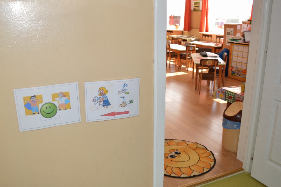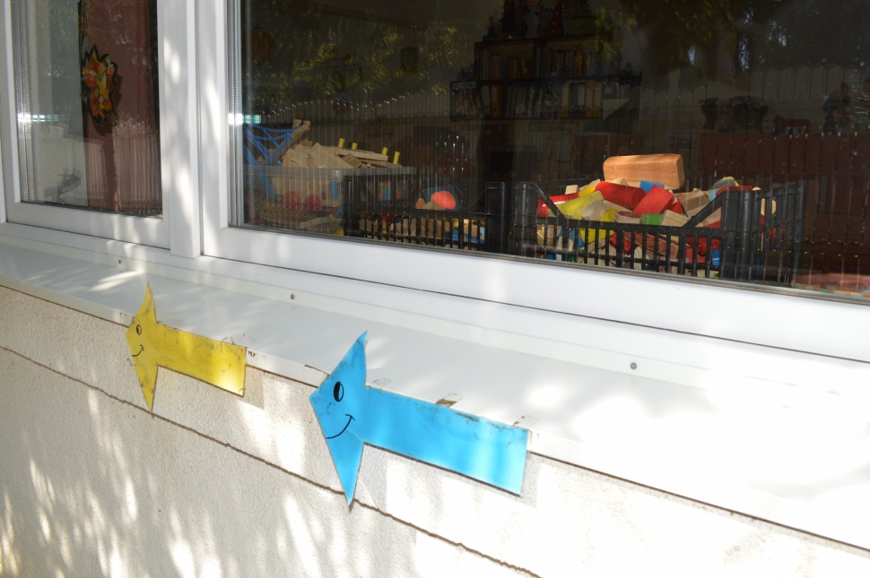 Színes, mosolygó nyilacskák segítik a gyerekeket a Csillagvár napköziotthonban, hogy a helyes irányba haladjanak, a csoportjuknak kijelölt helyen.