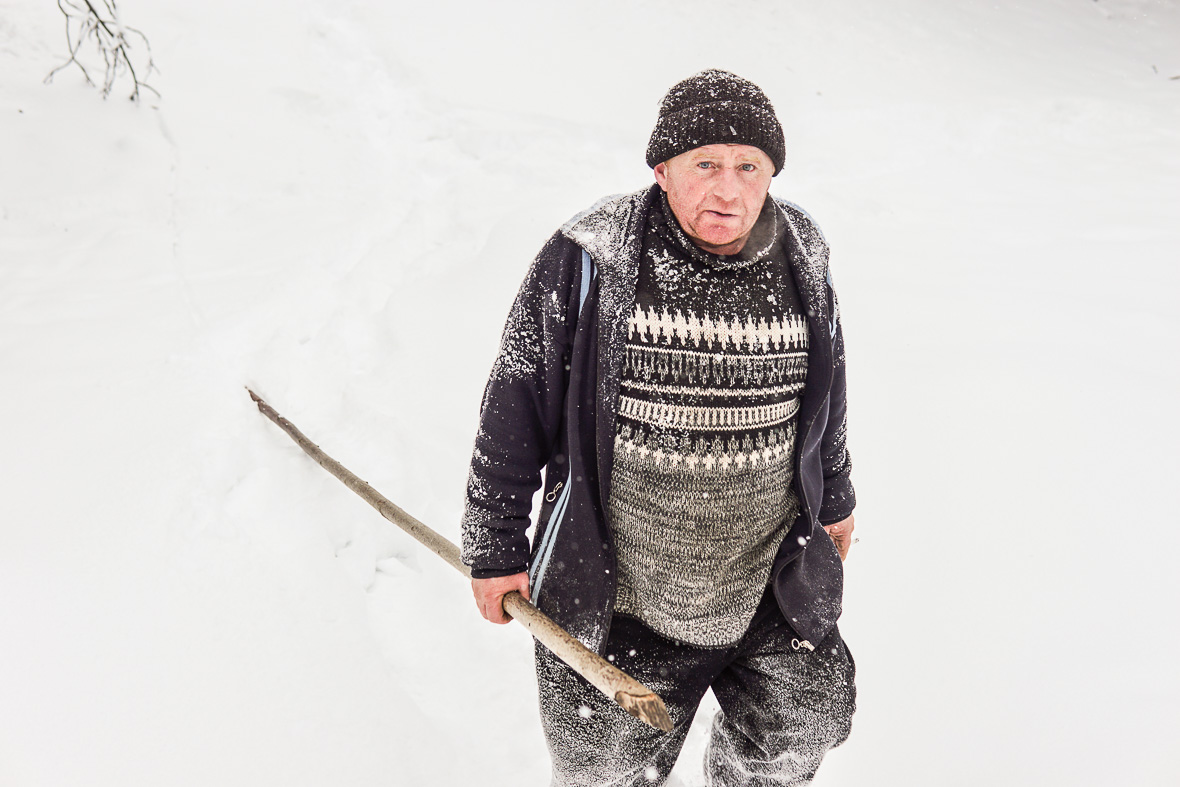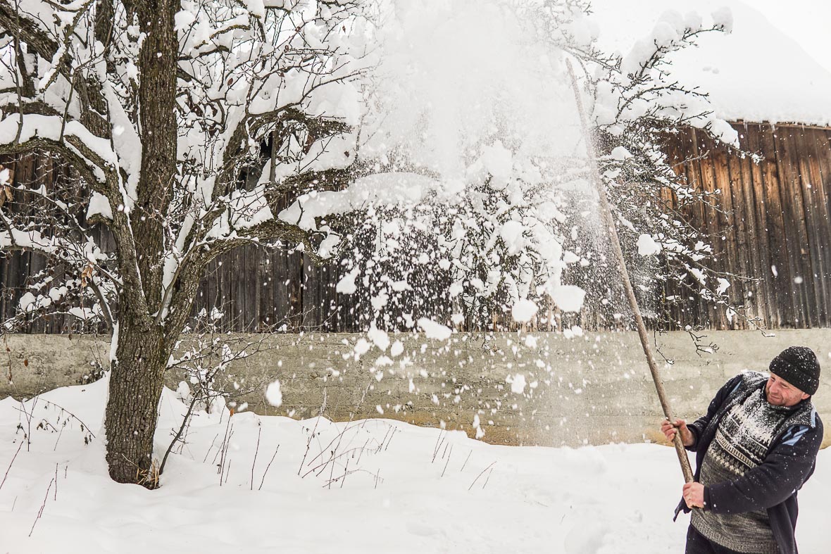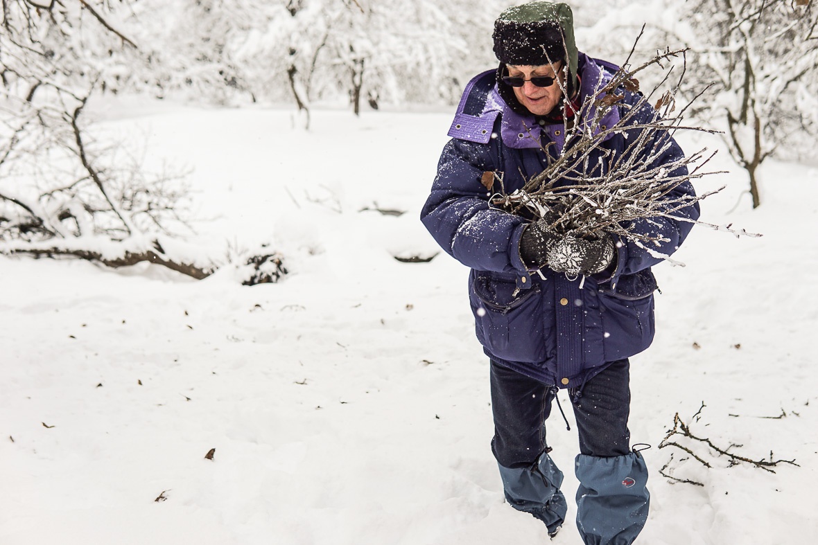 Bálint Árpádékhoz jöttünk, azzal az eltökélt szándékkal, hogy oltóvesszőt szedjünk, még akkor is, ha 20 centis hó van a fákon. Árpád bácsi (képünkön) mondja, hogy náluk nem ilyenkor szokás az oltóvesszőt szedni, de ha már a magyarországi vendégek most jöttek, s „leutaznak ezervalahányszáz kilométert” ezért, akkor kijön velünk a kertbe. Egyébként is ki akart jönni a kertbe, mert le akarta verni a havat a fákról, nehogy leszakadjanak a gyümölcsfák a hó alatt.