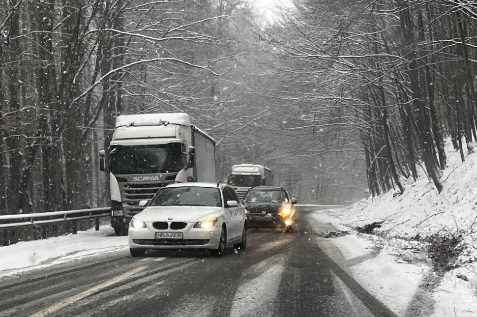 A 9 óra 30 perckor még tartó havazás ellenére Cătălin Romănescu, a megyén áthaladó országutakért felelős igazgató azt jelentette, hogy feketék, de nedvesek az utak, megszórták sóval a reggeli órákban, a bucsini, a borszéki és a hargitai útszakaszokon pedig bevetették a hókotrókat is. A Kalondán elakadt kamionokról neki nem volt tudomása, kérdésünkre elmondta, hogy szerinte a lendület hiánya és a rakomány rossz súlyelosztása okozhatja a gondot. Mindenesetre az útviszonyok miatt továbbra is kötelező a téli gumi.