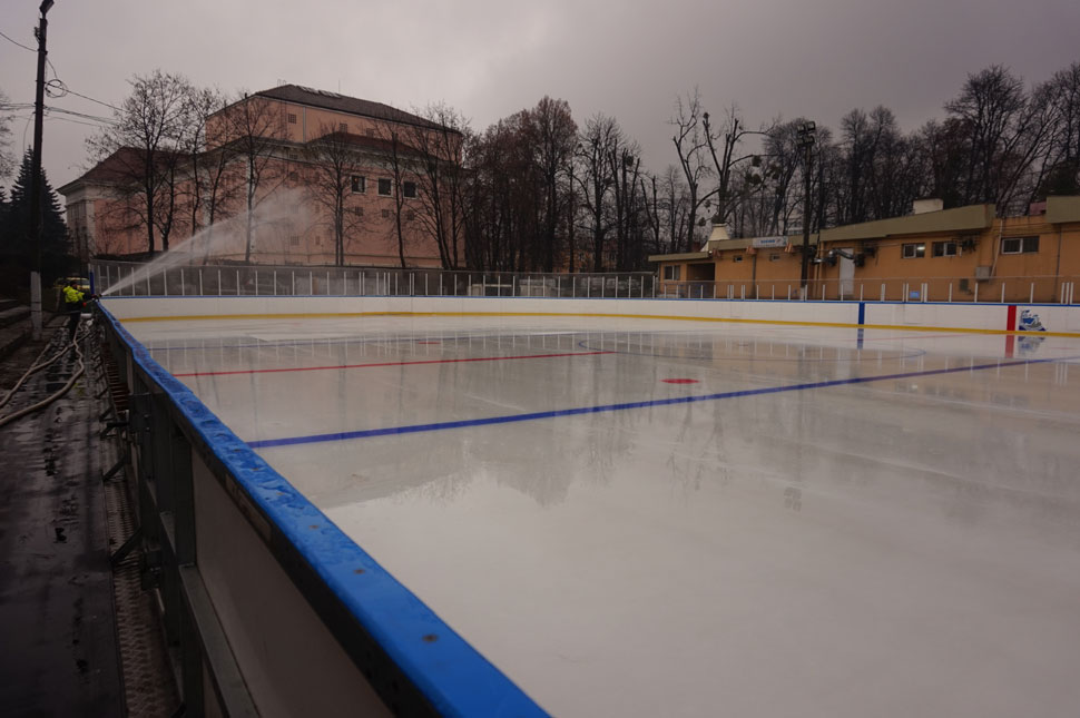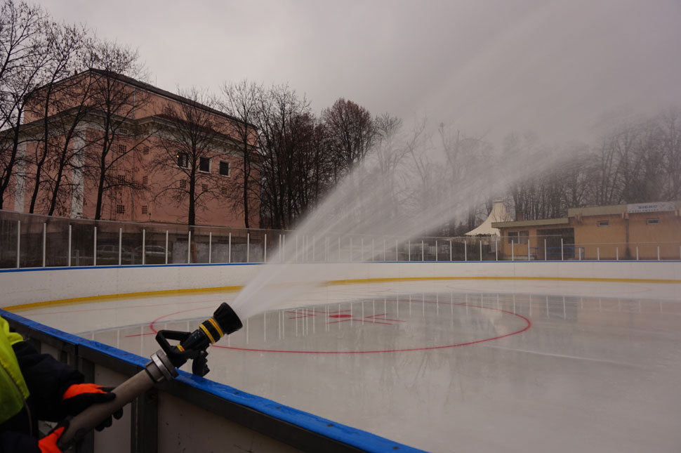 A szabadtéri jégpálya körvonalai már messziről látszanak a sétatéren, picit meg is nyugszom, hogy nem hiába jöttem. Ahogy közelebb érek, akkor veszem észre, hogy éppen locsolják a pályát, ami laikus szemmel nézve készen is áll, hogy fogadja a korcsolyázókat.