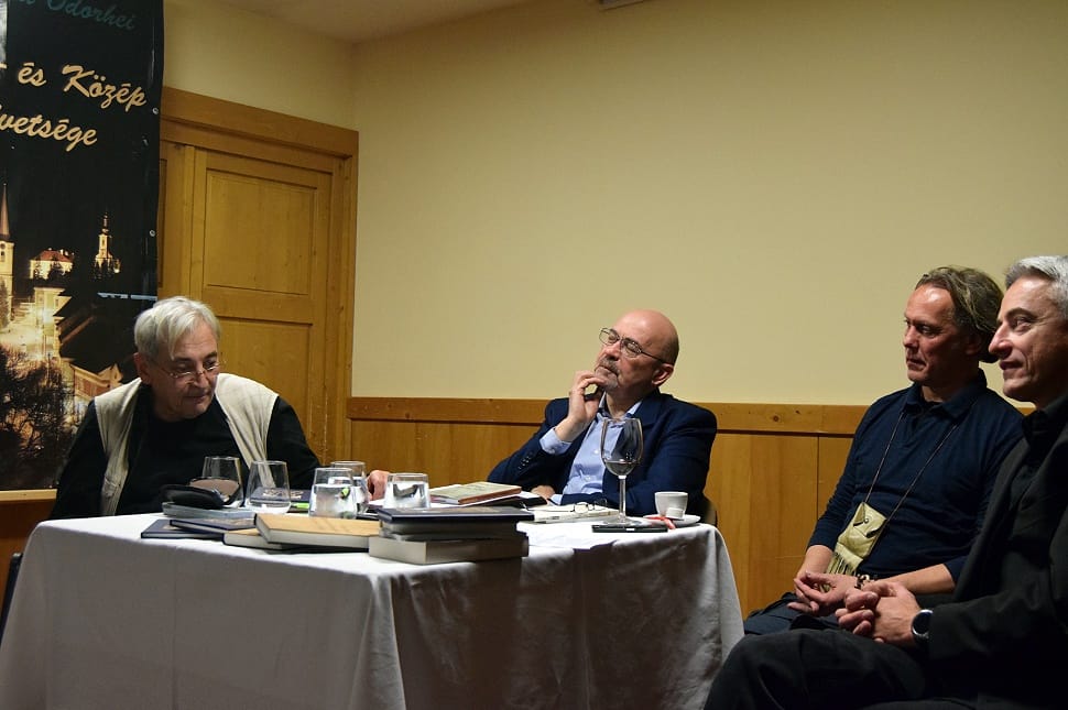 Közben előttem is készülődni kezd valami: asztalok és székek nyikorognak, amíg végül megtalálják a tökéletes helyüket. Az asztalra poharak kerülnek, majd víz és némi bor. Murányi Sándor Olivér oldalt lassan három kötetet húz elő egy zacskóból, majd leteszi őket az asztalra. Rövid idő múlva helyet foglalnak mind: az udvarhelyi író mellé Jász Attila, Markó Béla és Kovács András Ferenc ülnek le az asztalhoz.
