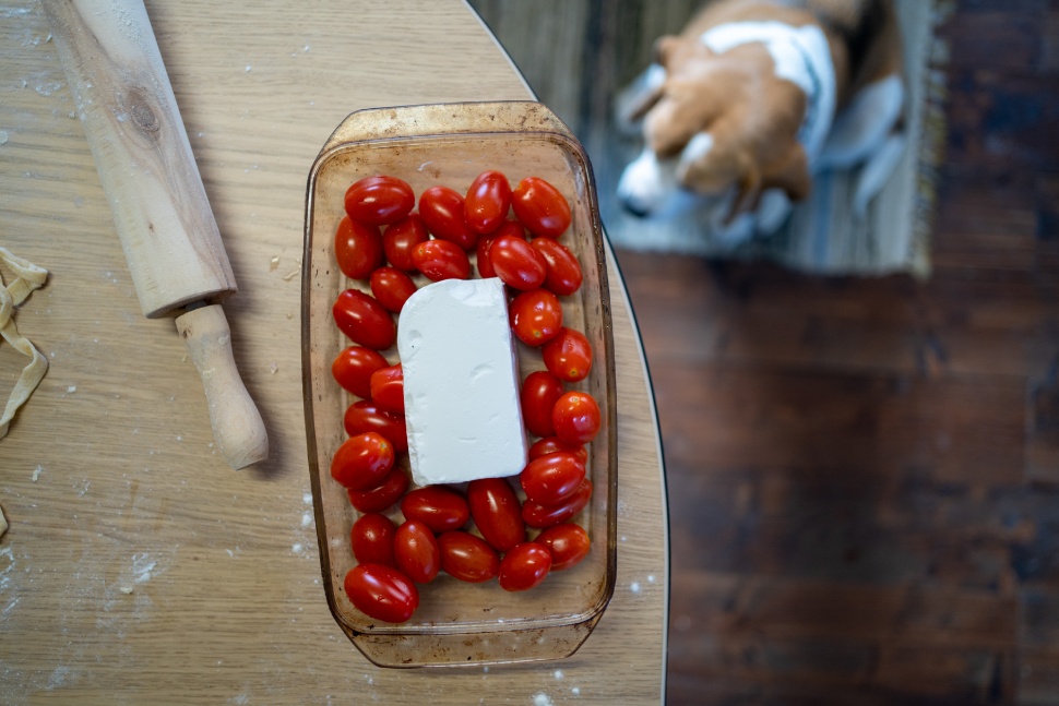 Egy doboz koktélparadicsom 5-8 lej között van, egy blokk feta szintén. Pénzszűke csekk. Nem kell semmit mérni, pácolni, dinsztelni, de még csak vágni vagy kavarni sem. Időszűke csekk. A végeredmény simán üti a legbonyolultabb pasta-szósz receptek szintjét. Ötletszűke csekk.