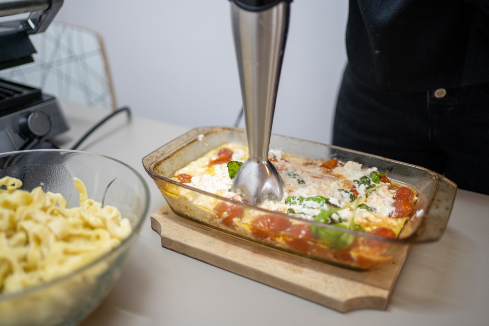 Beraktam a fetát a jénai közepére, köréje borítottam a megmosott paradicsomot, leolajaztam, beborsoztam, letakartam sztaniollal, s kb. fél órát sütöttem alul-felül sütőben 200°C-on. Aztán levettem a sztaniolt, s légkeverésesen még addig sült, amíg elkezdett barnulni a feta széle és a paradicsom. Ne égesd el – de azon túl saját ízlés. Ezt így egyből melegen lebotmixereltem egy fél bokor bazsalikom levéllel, s cső.