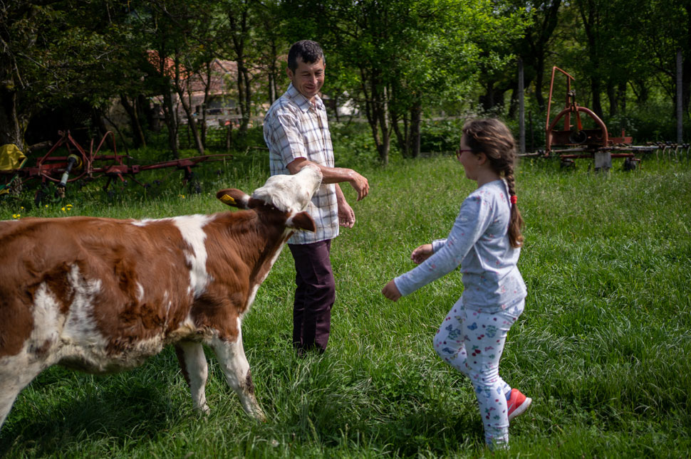 Itt találkozunk egy borjúval is végre, most csak ő van itthon, Piroska a neve – tudjuk meg Hildától. Piroska nem hagyja a gazdáját kettőt lépni egyedül, ott sétál a nyomában. „Jámbor állatok ezek, én így, a kezemből nevelem mindegyiket” – mondja Dénes, miközben a keze eltűnik valahol a boci szájában.