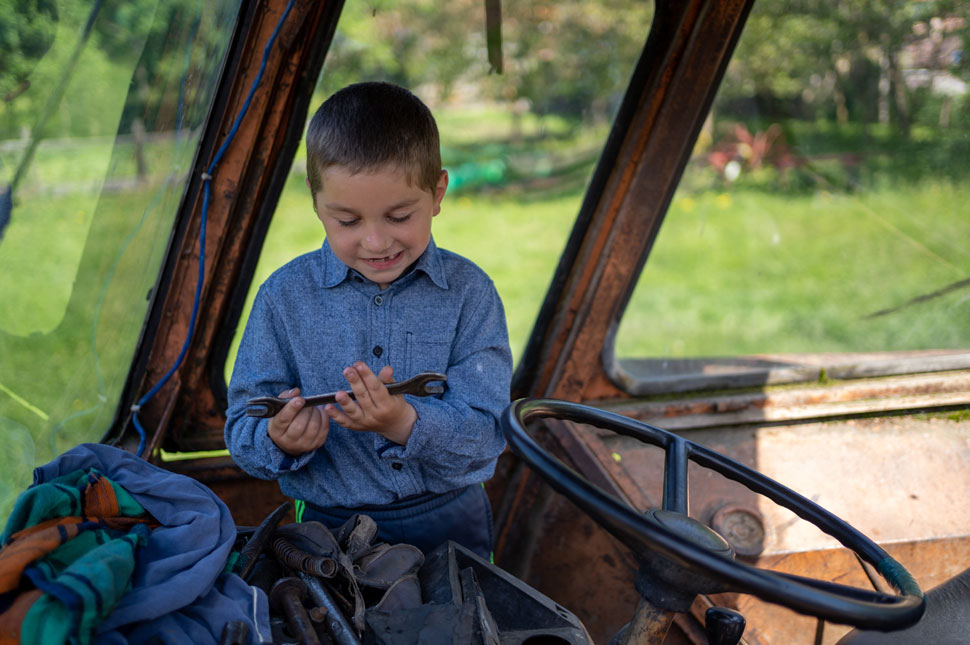 Két traktor áll az udvaron, az új és a régi, már csak az újat használja, de a régit semmiképp nem adná el Dénes, olyan nehezen vette meg. Egyébként még működik, Balázsnak ez a kedvenc játszóhelye. Utána a disznópajta, még egy nyúlketrec, és a kert végében a „gyengélkedő“, ha a tehénnek valami baja van, és gyógyulnia kell, ide zárják el, amíg talpra nem áll.