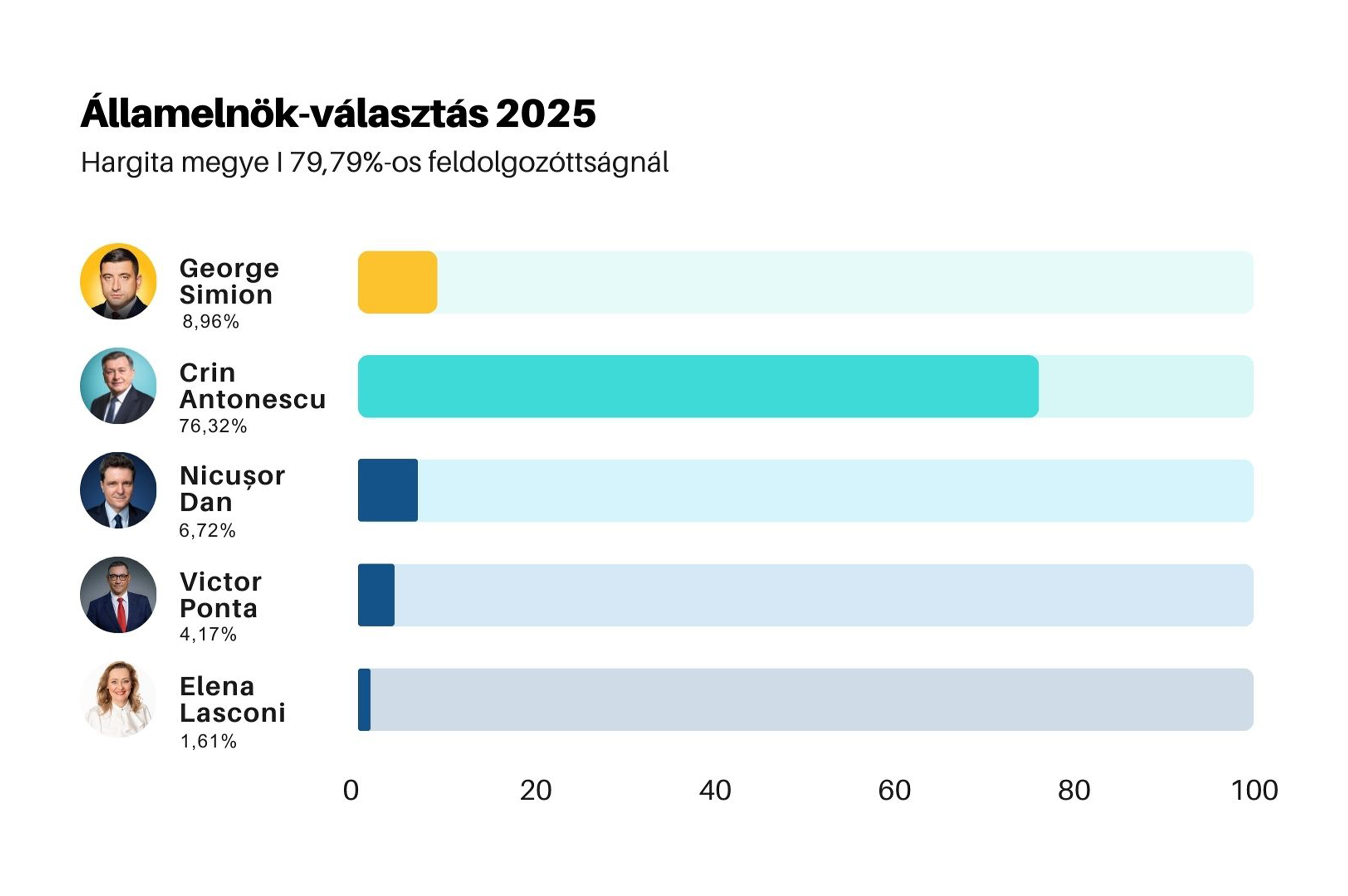 Az Állandó Választási Hatóság (AEP) valós idejű adatai szerint a szavazatok eloszlásának aránya Hargita megyében 79,79%-os feldolgozottságnál: George Simion (8,96%), Crin Antonescu (76,32%), Nicușor Dan (6,72%), Victor Ponta (4,17%), Elena Lasconi (1,61%).