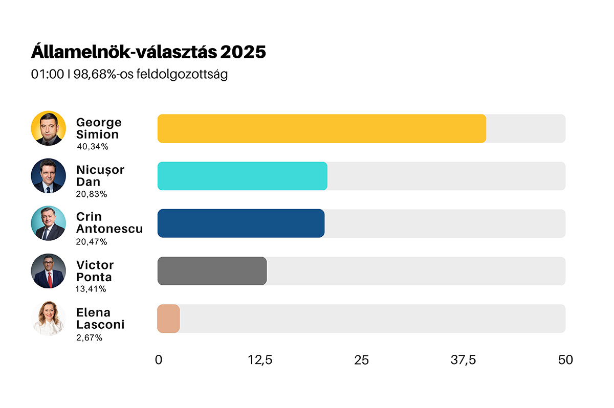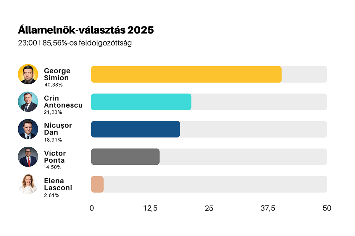 85,56 százalékos feldolgozottságnál George Simion (40,38%) vezet Crin Antonescu (21,23%), Nicușor Dan (18,91%), Victor Ponta (14,50%) és Elena Lasconi (2,61%) előtt az Állandó Választási Hatóság (AEP) valós idejű adatai szerint.