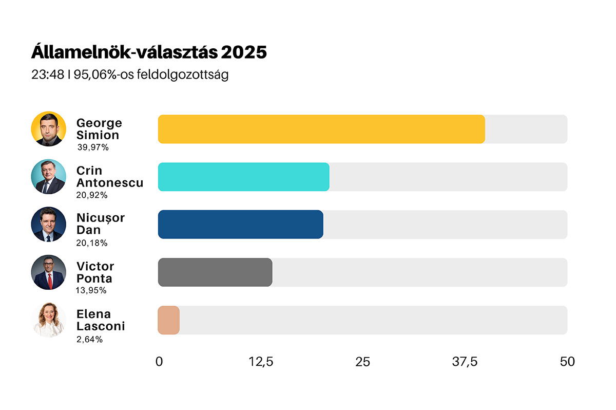95,06 százalékos feldolgozottságnál George Simion (39,97%) vezet. Őt követi Crin Antonescu (20,92%), Nicușor Dan (20,18%), Victor Ponta (13,95%) és Elena Lasconi (2,64 %) – derül ki az Állandó Választási Hatóság (AEP) valós idejű adataiból.