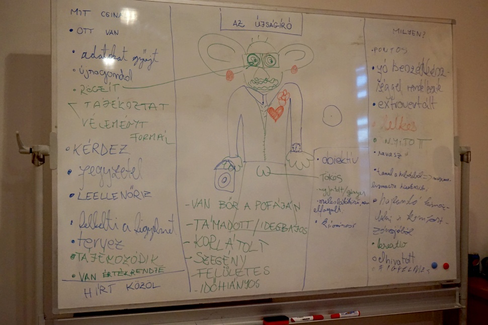 Miután összemértük a szupererőnket, megismerkedtünk – nevezzük Benőnek – egy képzeletbeli újságíróval, akit olyanra rajzoltunk, amilyen tulajdonságokkal és képességekkel egy újságírónak rendelkeznie kell. Azután a műfajok következtek, előbb a tényközlők (hír, tudósítás), aztán a vélemények, majd a köztes műfajok: a riport és az interjú. Mindezt képen, filmen és szövegben. A magunk gyártotta álhírekből megtudtuk, vasárnap betört egy panda a kocsmába, akinek azt írta a pólóján: ÉN.