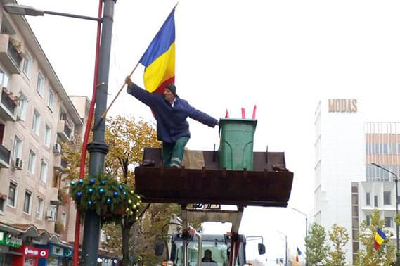 Râmnicu Vâlceán fotózták ezt a csodálatos képet kedden, november 27-én. Egy ember a homlokrakodó felemelt homlokán állva helyezi ki a villanyoszlopokra a román lobogót. Még van néhány kihelyezni valója: látható a hegyük az emberünk mellett levő kukában.